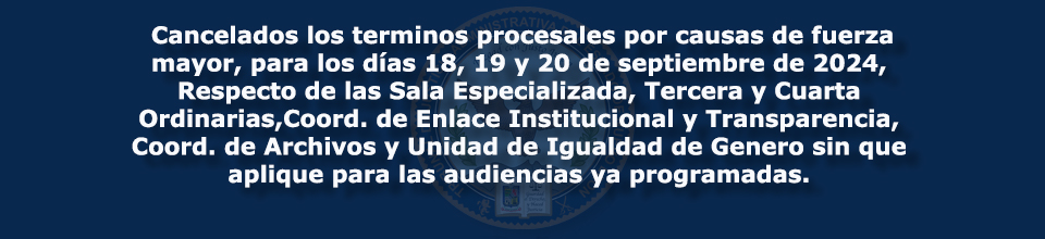 | Cancelados los términos procesales por causas de fuerza mayor, para los días 18, 19 y 20 de septiembre de 2024, Respecto de las Sala Especializada, Tercera y Cuarta Ordinarias, Coord. de Enlace Institucional y Transparencia, Coord. de Archivos y Unidad de Igualdad de Genero sin que aplique para las audiencias ya programadas. |